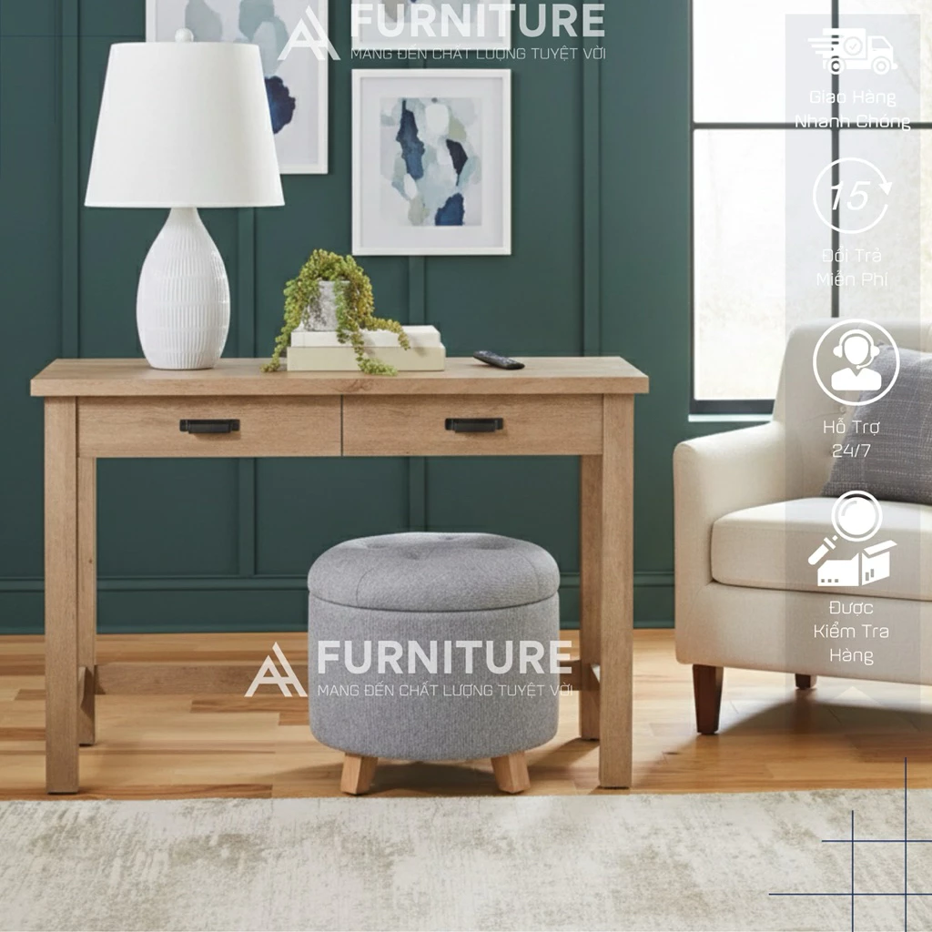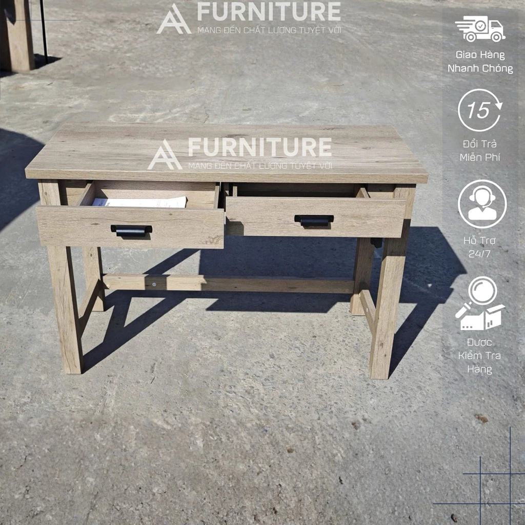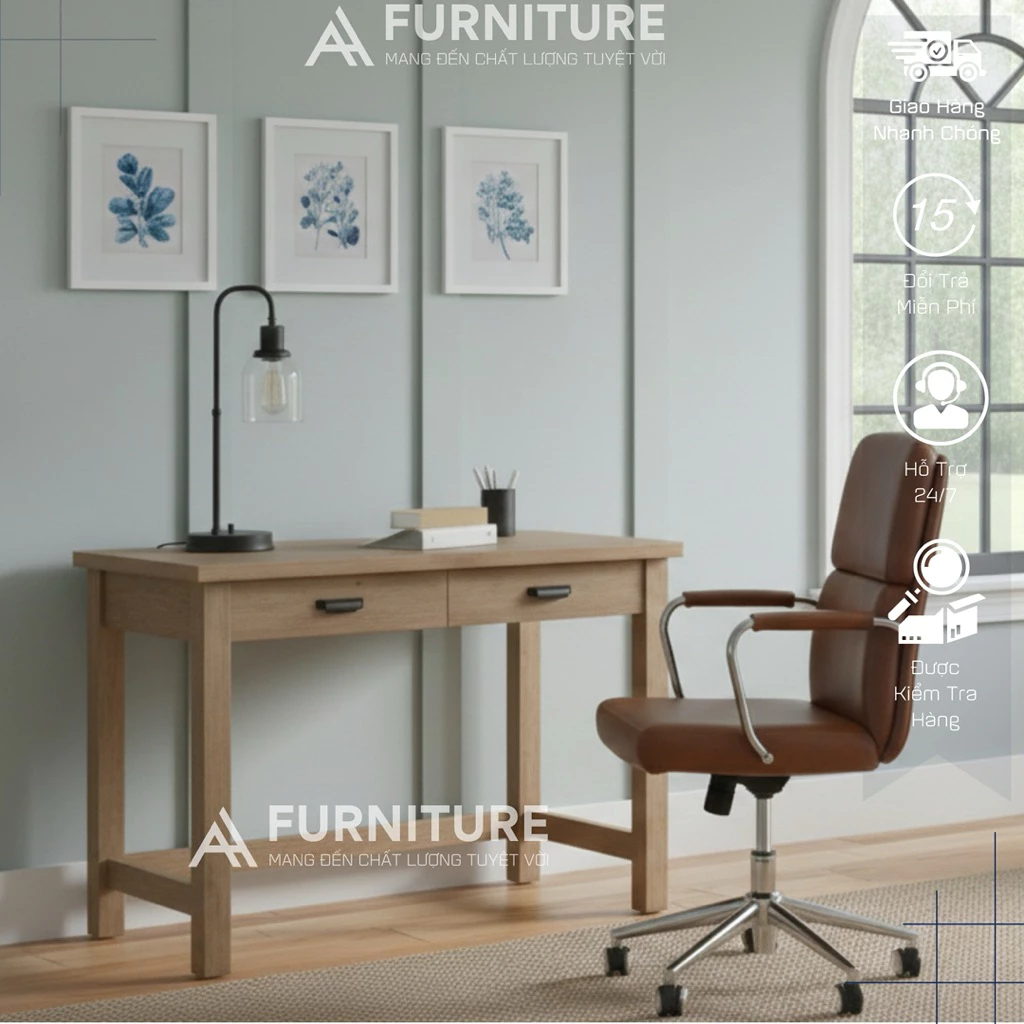 Chiếc bàn này không chỉ là nơi làm việc lý tưởng mà còn là điểm nhấn thẩm mỹ cho bất kỳ căn phòng nào, từ văn phòng tại nhà đến không gian làm việc chung. Ngăn kéo tiện lợi giúp bạn sắp xếp tài liệu, văn phòng phẩm gọn gàng, giữ cho mặt bàn luôn thông thoáng.