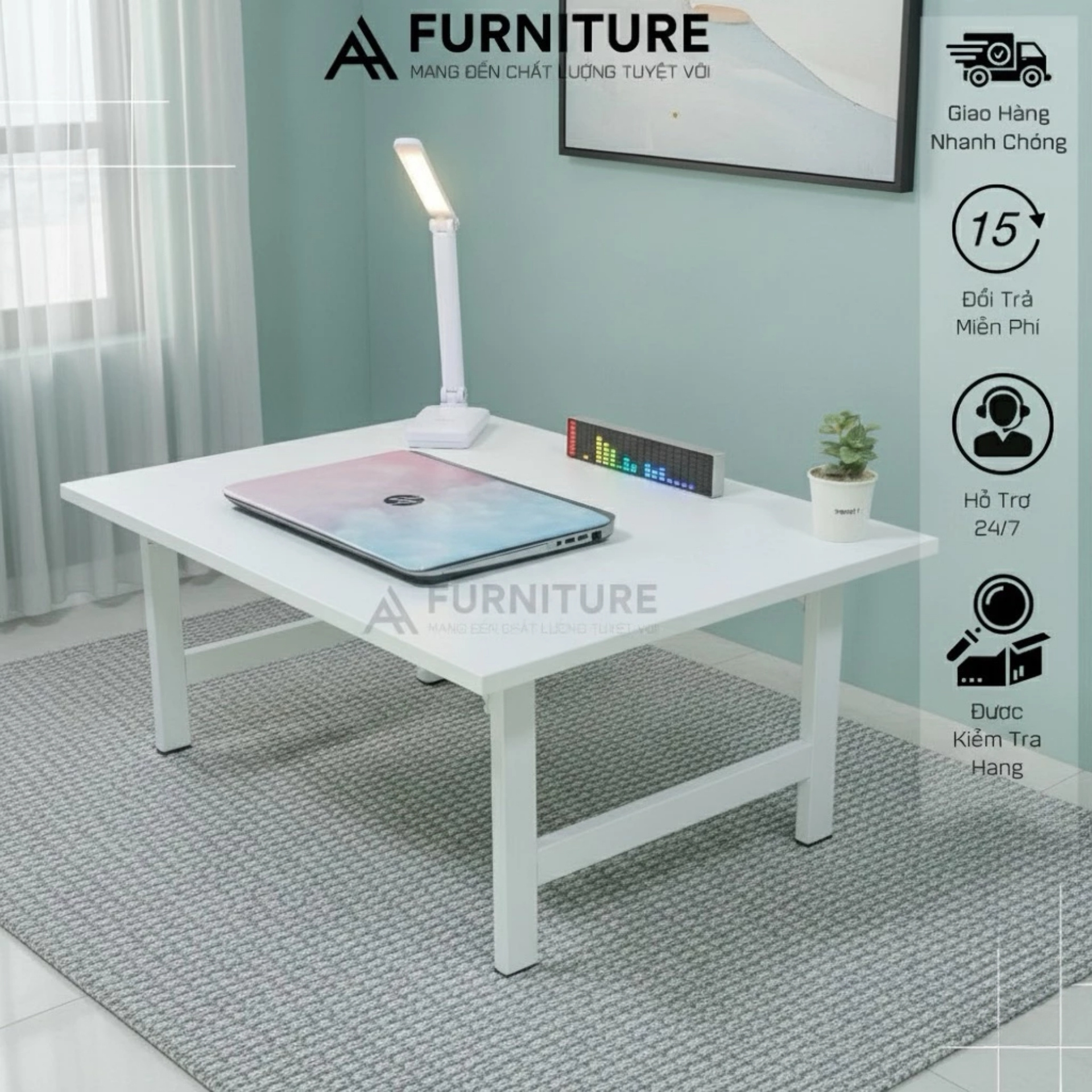 ‣ Mặt bàn gỗ MDF 17mm phủ Melamine 2 mặt, chống ẩm, chống trầy xước, dễ lau chùi.